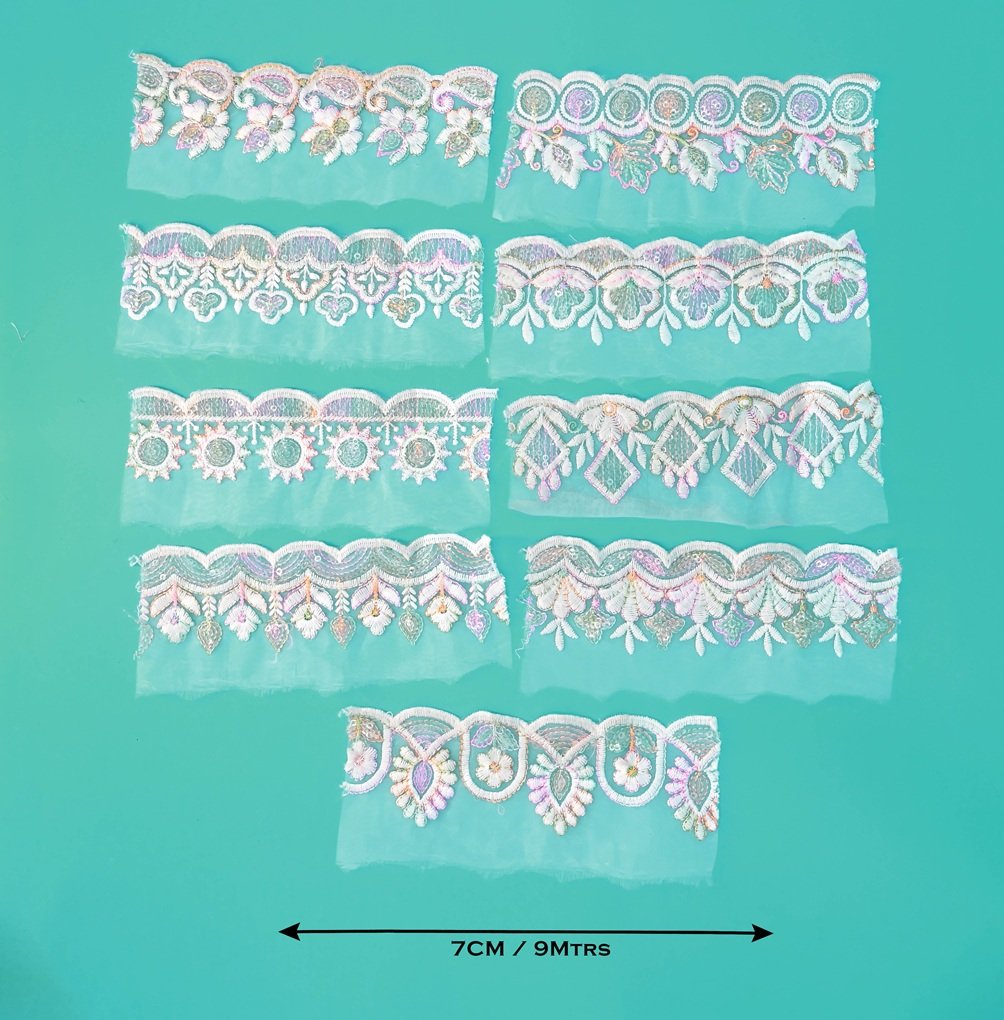 Organza lace is widely used in the textile and fashion industry for decorating garments with delicate and fashionable lace detailing. The multicolor embroidery pattern gives garments a unique and attractive appearance that enhances clothing such as kurtis, sarees, lehengas, gowns, dupattas, and designer dresses.