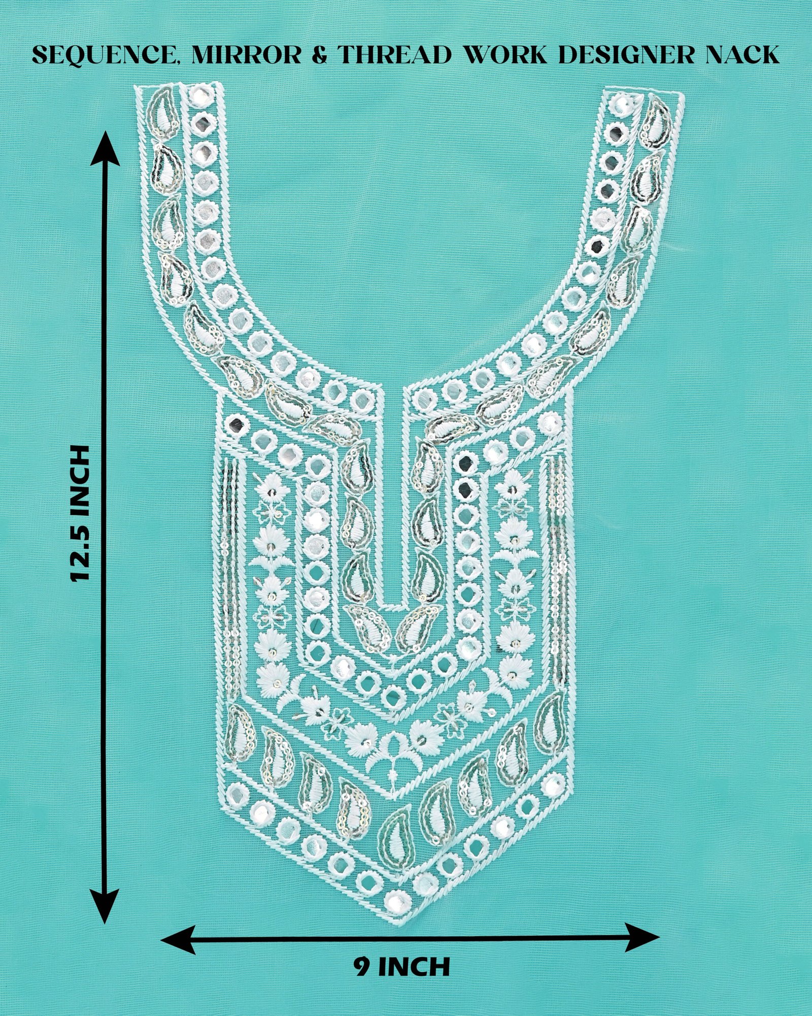 This designer neck patch is widely used in ethnic wear, bridal wear, festive clothing, and designer fashion garments. The combination of shimmering sequin embroidery and mirror embellishments creates a stunning visual effect, making garments stand out with elegance and sophistication.